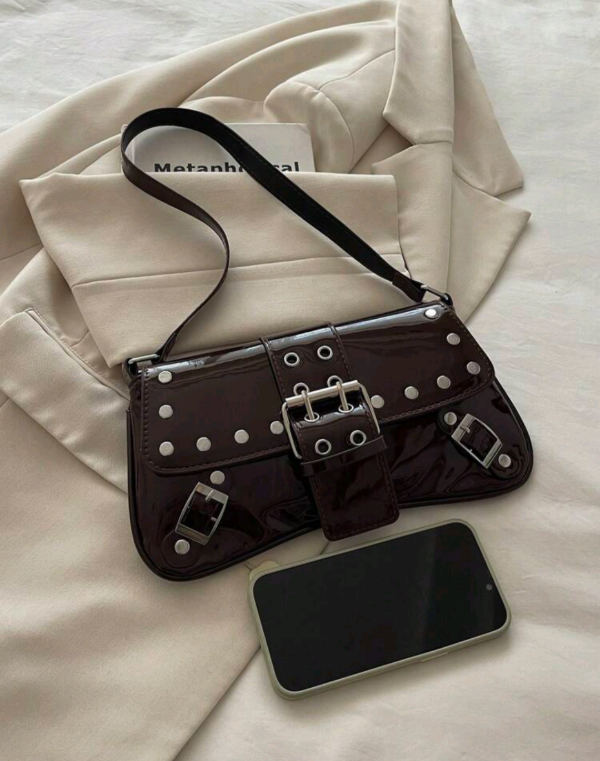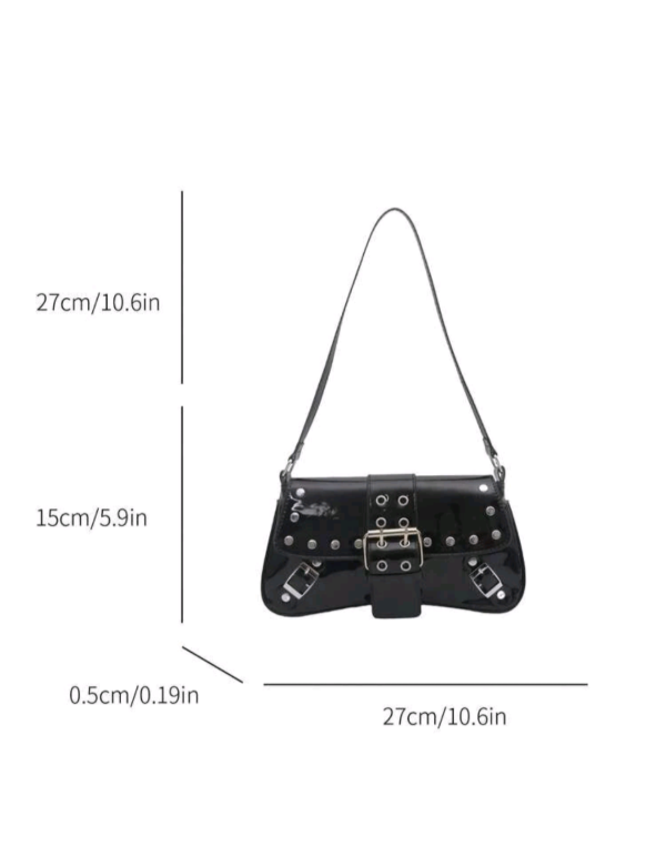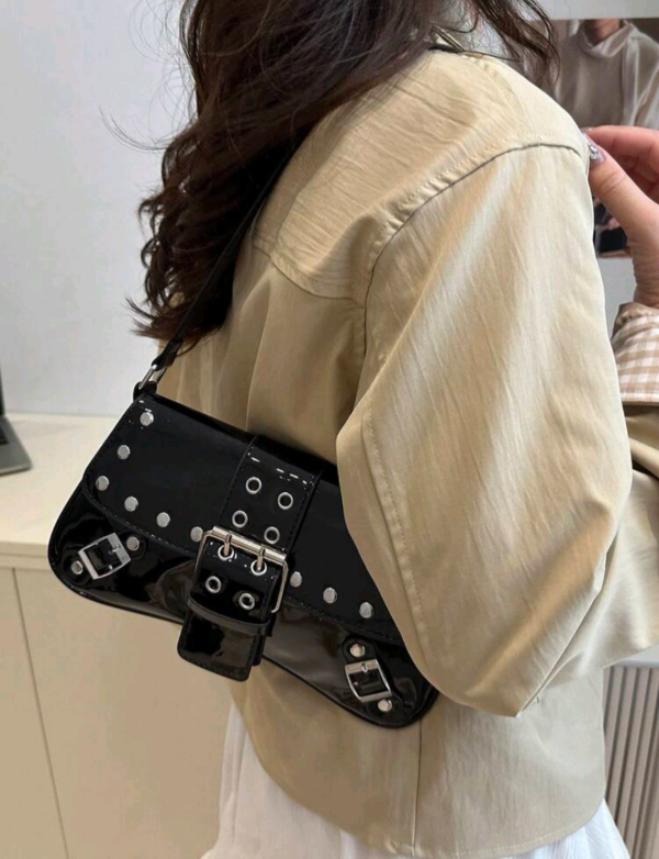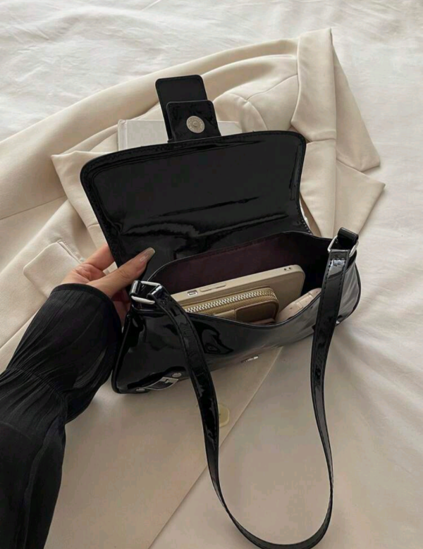 Llevá tus esenciales con estilo y actitud con esta mini bag estilo baguette importada. Confeccionado en cuero PU charolado le da un brillo único, mientras que los herrajes plateados y el cierre de broche suman un toque sofisticado y moderno. Compacta, juvenil y perfecta para looks de noche, se convierte en el accesorio ideal para destacar tu estilo trendy y chic en cualquier salida.