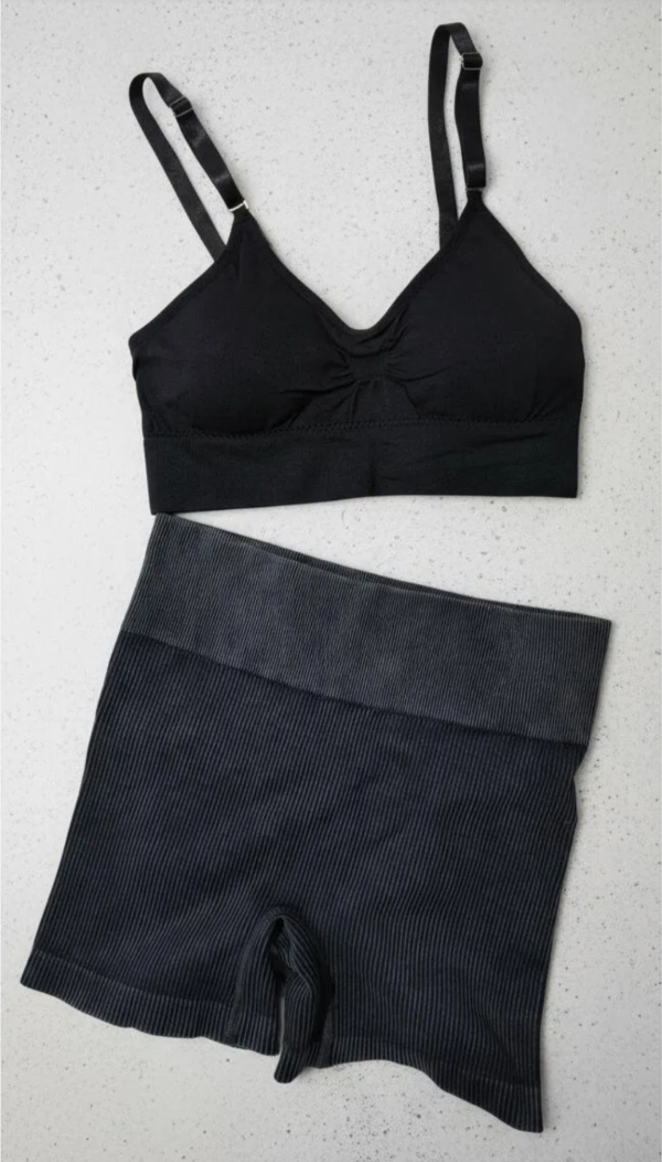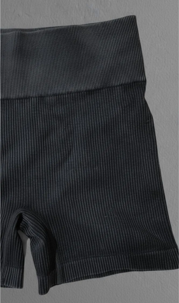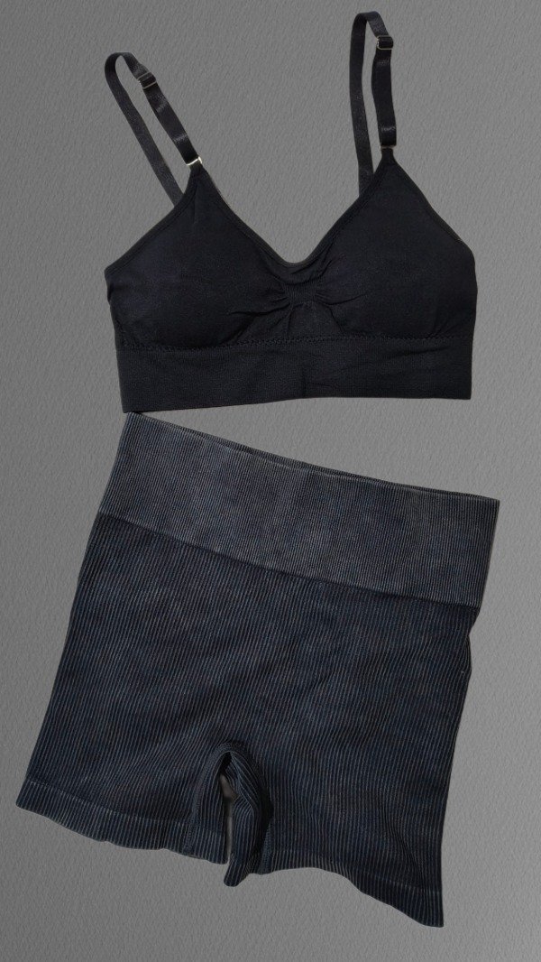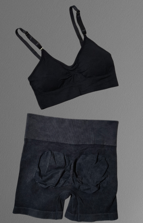 Confeccionado en tejido acanalado elástico de alta calidad, este conjunto de top + calza corta levanta glúteos se adapta al cuerpo realzando tu figura sin perder confort.